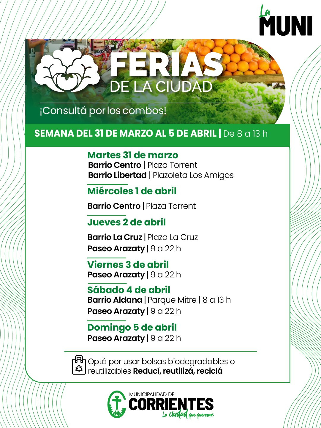 Entre el martes 31 de marzo y el domingo 5 de abril, las ferias itinerantes organizadas por la Municipalidad de Corrientes realizarán su habitual recorrido por espacios públicos de la ciudad, con su oferta de productos de calidad y mejores precios. Los vecinos podrán adquirir frutas y verduras, productos manufacturados, artesanías, plantas ornamentales, entre otras propuestas.