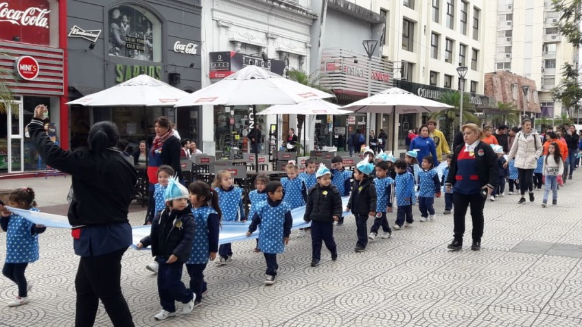 Este jueves, cerca de 80 niños del CDI IV del barrio San Marcos, junto al instituto Crecer con Todos, recorrieron la peatonal Junín desde la plaza Cabral hacia la plaza Vera, donde hicieron entrega de escarapelas a los comerciantes y vecinos de la ciudad y flamearon una gran bandera argentina de más de 50 metros.