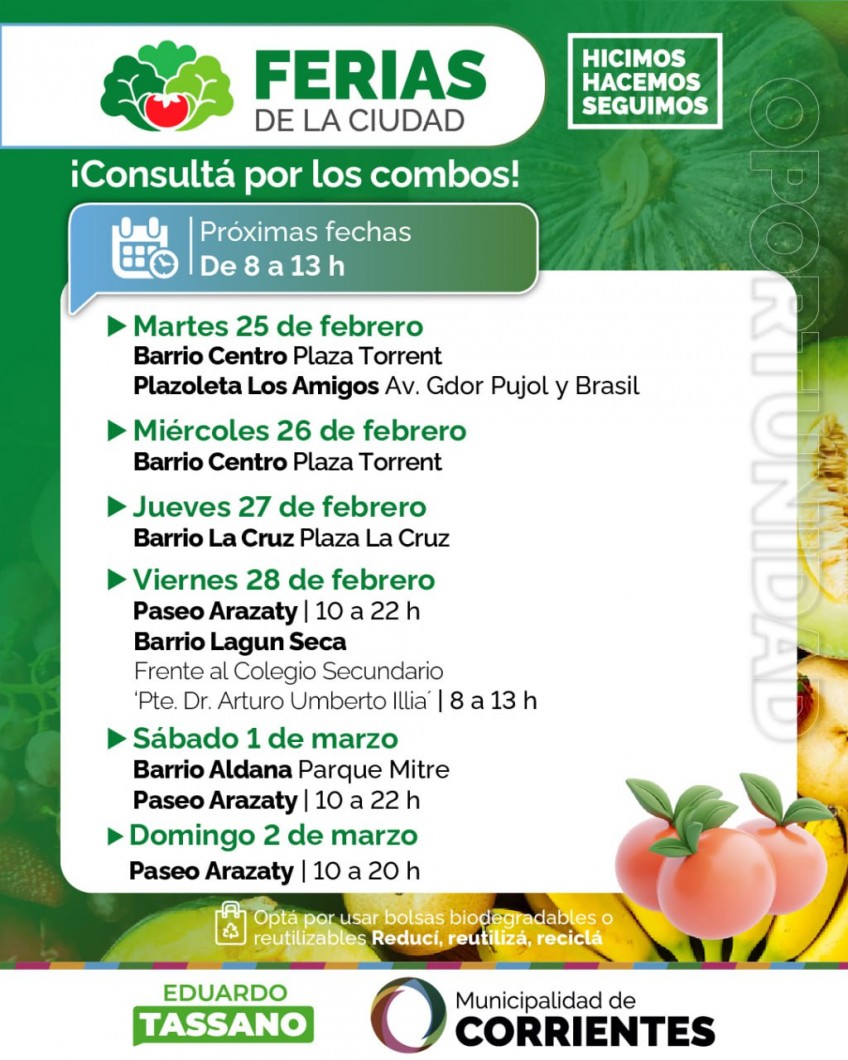 De manera simultánea, las Ferias de la Ciudad arrancarán el martes 25, de 8 a 13, su recorrido semanal en la plaza Torrent -San Lorenzo y Bolívar- y en plazoleta Los Amigos del barrio Libertad, frente a la escuela Nº6 por calle Brasil. En tanto, la céntrica plaza Torrent volverá a ser escenario de la propuesta el miércoles 26.