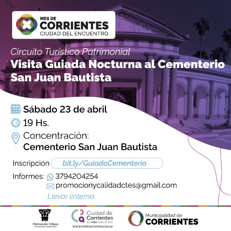 Las propuestas se enmarcan en las actividades por el Mes de Corrientes. Habrá visita guiada nocturna al cementerio San Juan Bautista, recorrido por el centro histórico y monumentos arquitectónicos. Con acompañamiento de guías turísticos, los paseos son totalmente gratuitos. En la nota se encuentran los detalles de cómo participar.