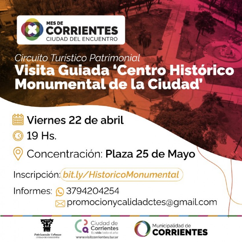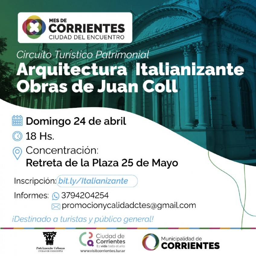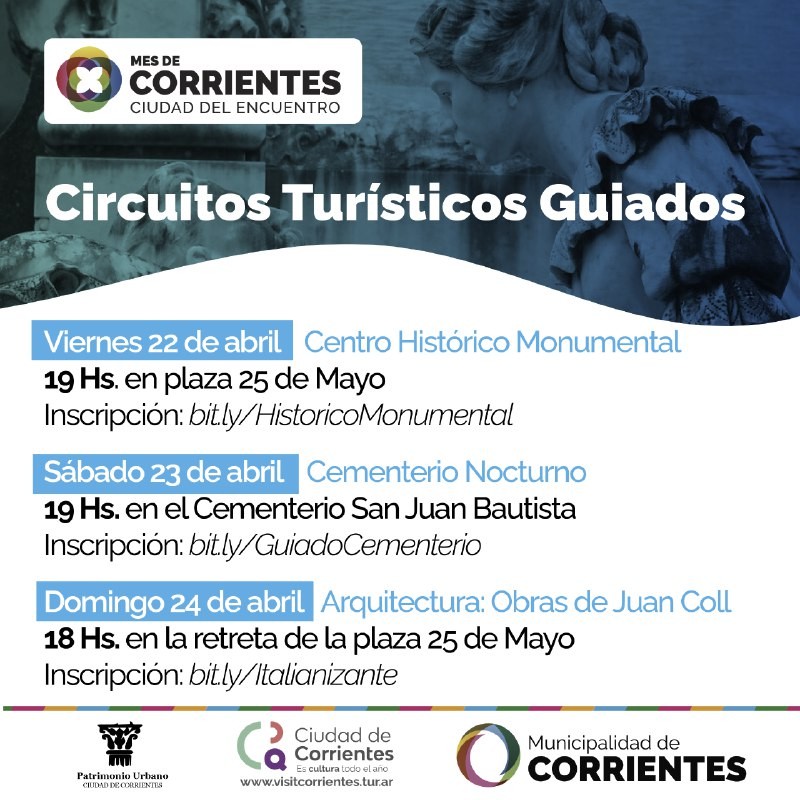 Continuando con las diferentes propuestas culturales y recreativas que desarrolla la Municipalidad capitalina para celebrar el Mes de Corrientes, esta semana habrá tres paseos guiados para que vecinos y turistas conozcan diferentes espacios de la ciudad que forman parte del circuito turístico patrimonial. El viernes habrá un recorrido por el centro histórico, mientras que el sábado una visita guiada nocturna al cementerio San Juan Bautista y el domingo la historia y arquitectura italianizante de la ciudad a través de un paseo por las obras de Juan Col.