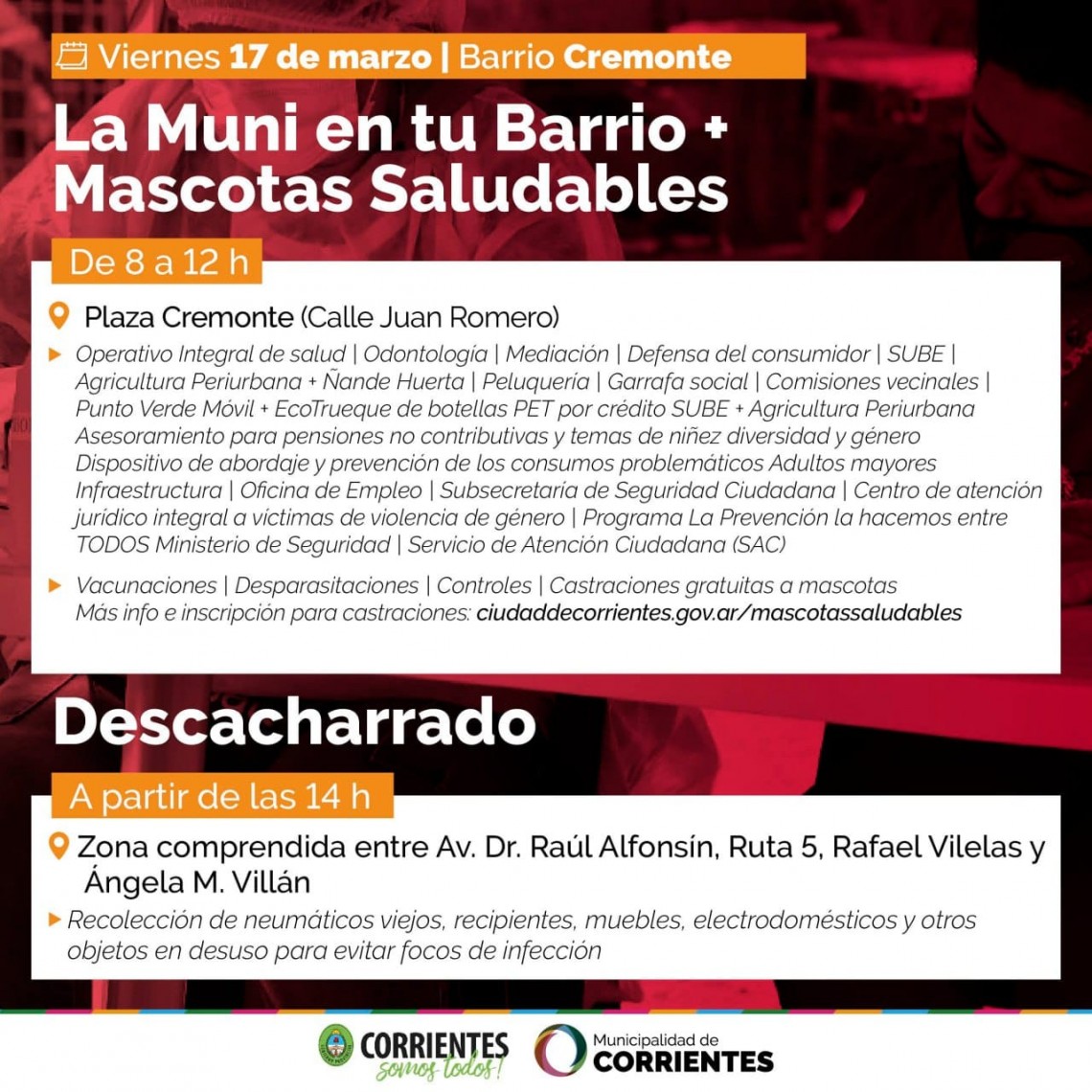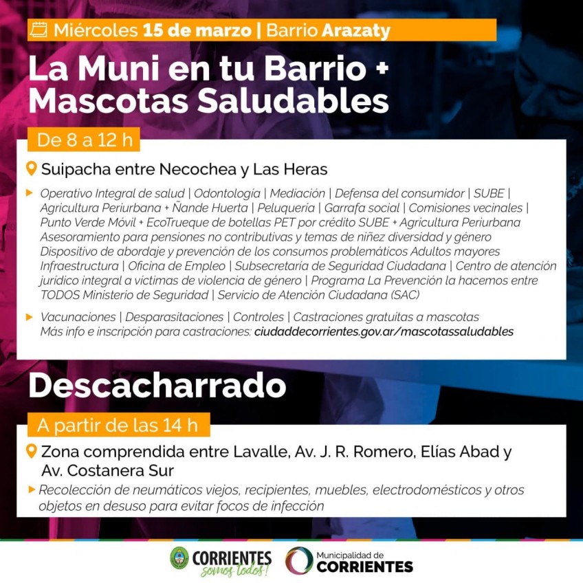 El programa La Muni en tu Barrio, organizado de forma conjunta entre la Municipalidad de Corrientes y el Gobierno provincial, que incluye prestaciones integrales gratuitas para los vecinos de distintas barriadas, se presentará este miércoles 15 de marzo en el barrio Arazaty, y el viernes en el barrio Cremonte.