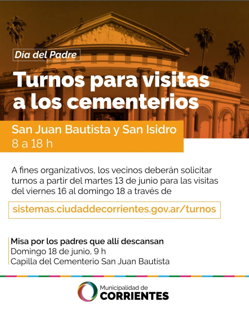 La Municipalidad de Corrientes informa que por cuestiones organizativas relacionadas con la celebración del Día del Padre, se solicitará sacar turnos para visitas a quiénes tengan previsto concurrir los días viernes 16, sábado 17 y domingo 18 de junio a los cementerios San Juan Bautista y San Isidro Labrador.