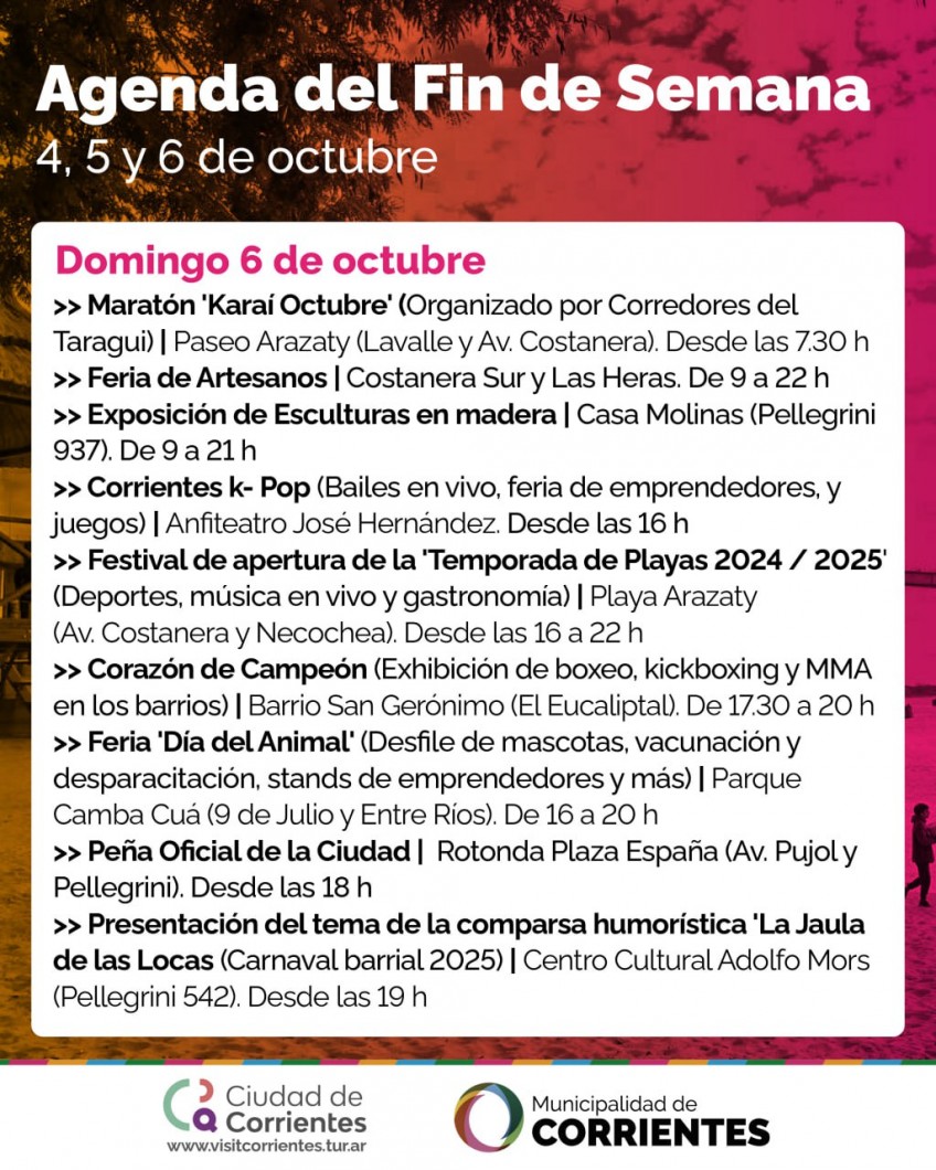La Municipalidad de Corrientes preparó un gran festival para abrir formalmente la temporada en los cinco balnearios públicos que, de octubre a abril, ofrecerán servicios y seguridad a miles de correntinos y turistas. Este evento se suma a las múltiples alternativas que se desarrollarán durante el fin de semana en otros puntos de la capital, como peña, festival k-anime, k-pop, chamamé, carnaval y maratón.