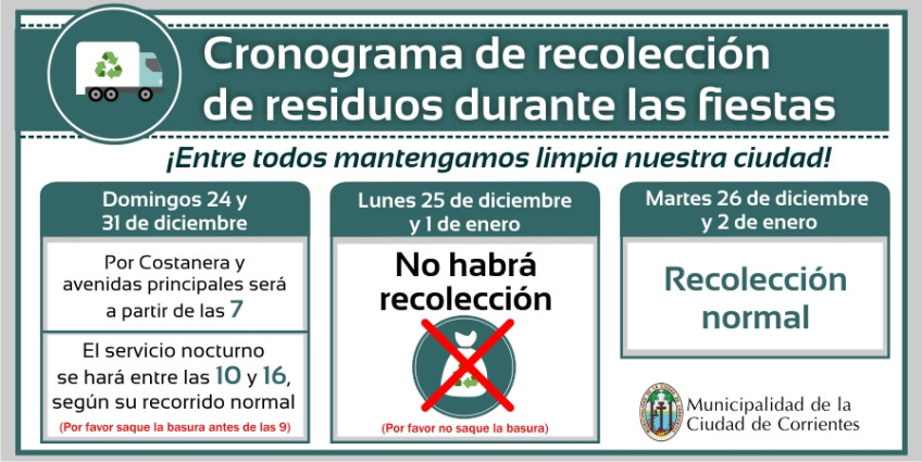 La Secretaría de Ambiente comunicó que los días domingo 24 y 31 de diciembre la recolección de residuos durante la mañana se realizará por Costanera y principales avenidas de la ciudad; mientras que la prestación que se realiza habitualmente en horario nocturno, se adelantará esos días a partir de las 10 y hasta las 16.