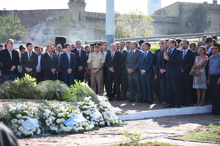 El Jefe Comunal, acompañado de las más altas autoridades, procedió seguidamente a izar el Pabellón Nacional, bajo los acordes de la canción Aurora, ejecutada por la Banda de Música de la Policía de la Provincia.