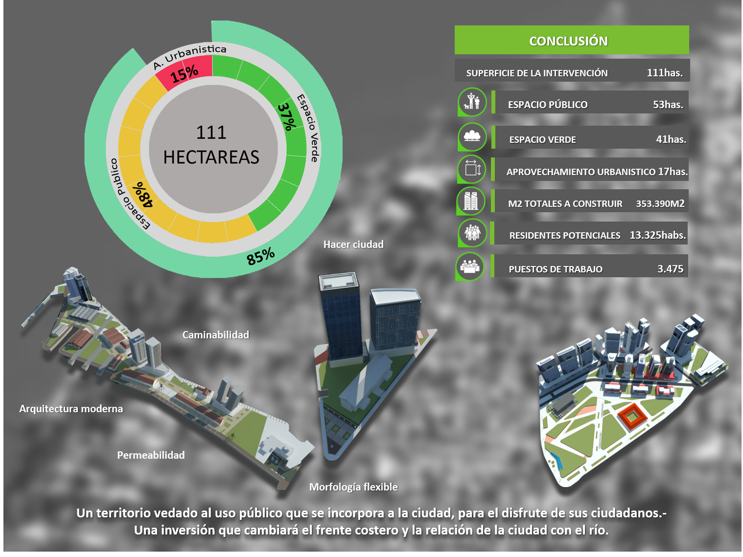 Es una iniciativa nunca antes vista, que generará un gran impacto en la ciudad en diferentes aspectos: el uso y acceso a espacios verdes para los vecinos con los que hoy no se cuenta; el despegue turístico; el desarrollo económico y las fuentes de trabajo; y la recuperación de la zona costera, el puerto, el regimiento y zonas de influencia; dando a la ciudad una nueva identidad en su relación con el río.