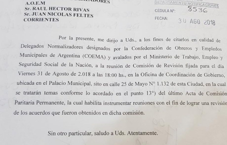 El Departamento Ejecutivo Municipal citó para éste viernes 31, a las 18, a las actuales autoridades de la AOEM, a la reunión de Comisión de Revisión en el marco de la Mesa de Paritari